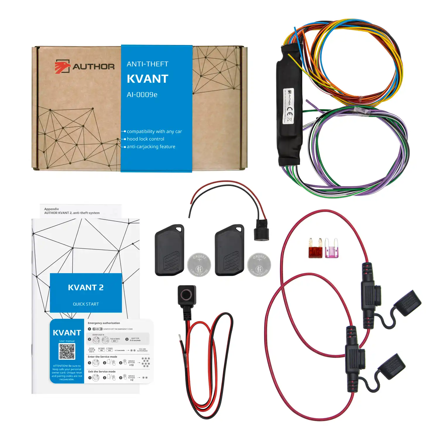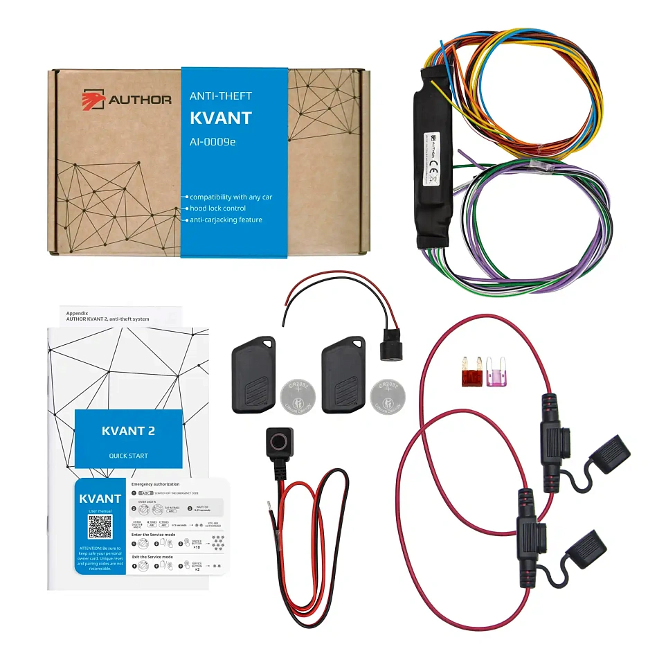 AUTHOR KVANT 2 Kit is designed to protect your car against theft or carjacking. In the Armed mode, the device blocks the engine by breaking the standard electrical circuit via a built-in relay. The device is also equipped with outputs that help you manage an auxiliary electromechanical hood lock.